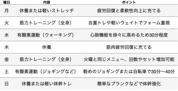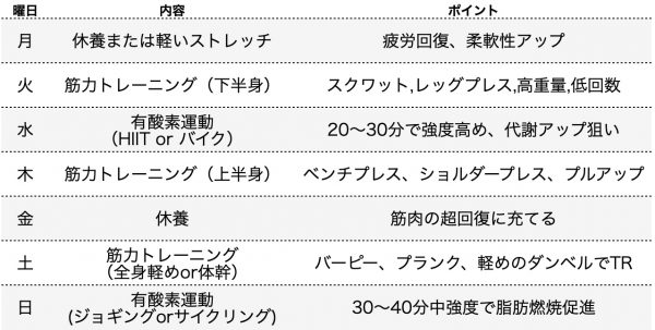 筋力アップと脂肪燃焼を効率よく両立させるには、運動種目のバランス・強度・頻度だけでなく、スケジュールの組み方も重要です。ここでは、初心者と中級者におすすめの週間スケジュール例を具体的に解説します。